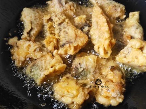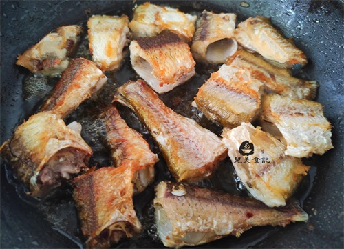 二、锅中倒油,油温热时放入小鱼块,炸至两面金黄香酥捞出备用;