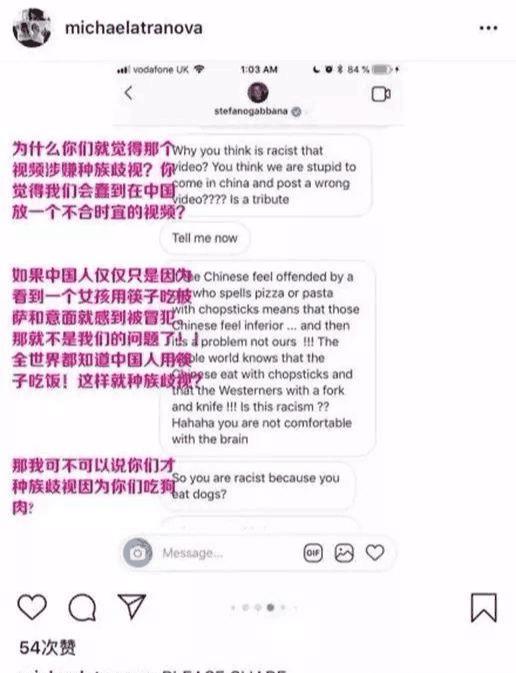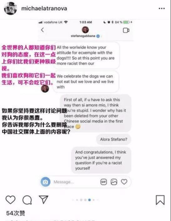 21日中午11时许,ins上网友和杜嘉班纳设计师同时也是创始人之一的Stefano Gabbana的一段真实的对话截图开始迅速在微博扩散,时尚博主@Fashion_BangZ @iDest 等相关截图微博均获得了不少转发,若说此前关于广告视频,网友们各有解读,对于“辱华”之说还略有争议,那么截图一出,杜嘉班纳可以说是坐实了辱华之名,网络舆论一片哗然。