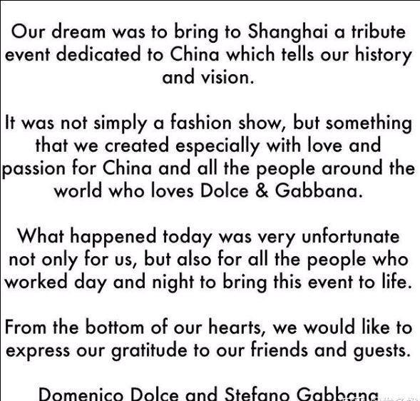“我们原本梦想着,把一场为中国专属而设,可以展现我们品牌与想象力的活动带到上海。这不仅仅是一场时装秀,而是我们怀着对中国以及全球所有喜爱D&G品牌的人的爱与热情,创造出来的产物。今天发生的一切不仅对我们来说非常不幸,对为把这场秀带到现实中来日日夜夜工作的所有人来说,都很不幸。我们发自心底地感谢所有我们的朋友和客人。”