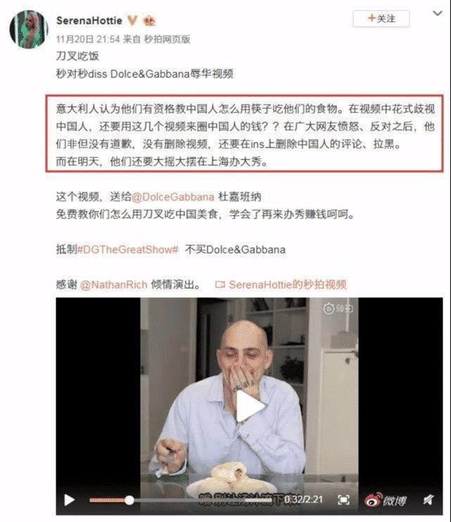 然而,这则广告引起了中国网民的不满。一些网民指出,电影中叙述者的“汉语发音”和语调,以及“中国模特”用筷子吃比萨饼和意大利甜面包卷,都涉嫌歧视中国传统文化。尽管@ Dolcgabbana在微博上删除了这段视频,但它仍然将它发布在即时新闻和Facebook账户上,这一“涉嫌侮辱中国”的事件在外国社交媒体上引起了很多争议。然而,由于微博视频已经被删除,杜嘉班纳邀请了许多受欢迎的明星参加时装秀,包括杜嘉班纳的亚太品牌大使王克瑞和迪拉巴,微博平台上早期的公众舆论集中在穆克文、王克瑞和其他明星粉丝身上。然而,也有很大的V型问题和声音。11月20日21 : 54,时尚博主@ Serena Hottie发布了一段视频,视频中“几秒钟内用刀叉吃饭,反对Diss Dolce & Gabbana侮辱中国”,谴责Dolce & Gabbana“在圈子里歧视中国钱”,并在推特上发了6K多次。