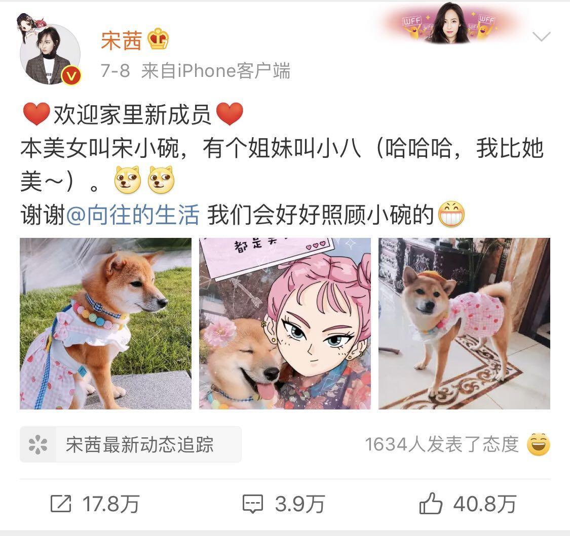 微博里宋茜除了表示欢迎小碗的到来,还不忘调侃道:“本美女叫宋小碗,有个姐妹叫小八(哈哈哈,我比她美~)”宋茜能发出这样的内心独白,足以说明小碗给她带来了不少欢乐,收养小碗对她来说一定非常激动。
