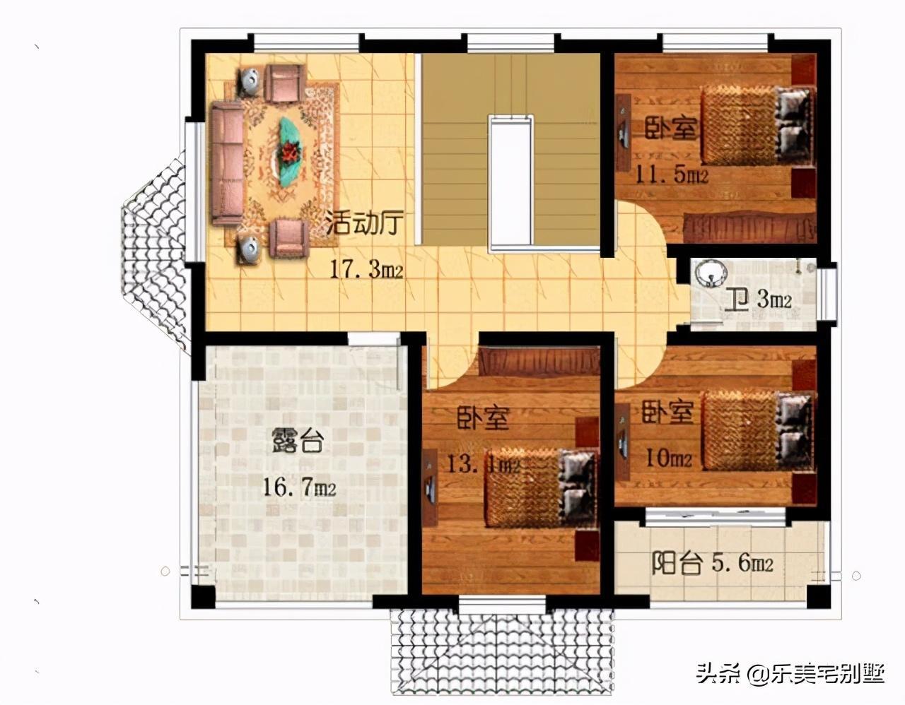 二层:活动厅、2卧室、卧室(带阳台)、露台、卫生间