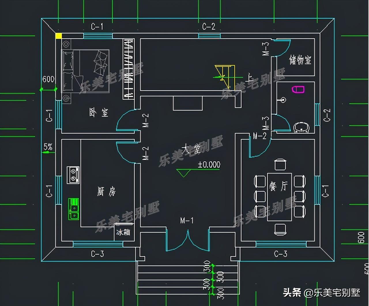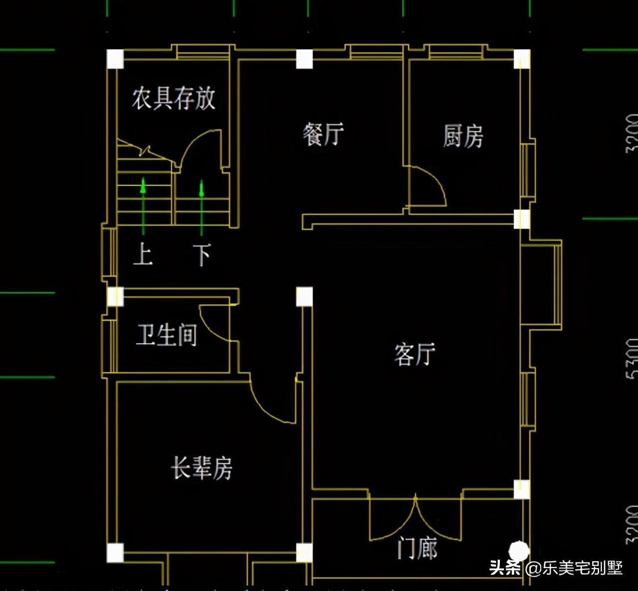 一 层:长辈房(附卫生间)、客厅、餐厅、厨房、农具存放室
