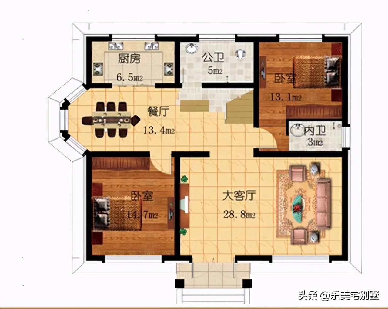 该户型外观造型与户型4相似,室内布局不同,占地110平方米,户型小,造价低,在农村建造它非常实用不浪费。二层农村别墅非常适合农村,小户型也满足一般家庭居住。