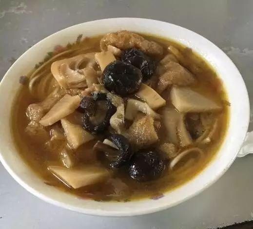 一抹面条整齐地铺着,宛如古代江南女子的发髻,充满意韵。面上汤内散布着深棕色的蕈块,清香扑鼻,引人食欲。面条入口,鲜、香、滑的感觉依次在口中弥漫开。轻轻咀嚼,唇齿间,面的糯软与蕈的脆嫩相得益彰。合着面汤咽下,一路潺潺而下,一直熨帖到胃。