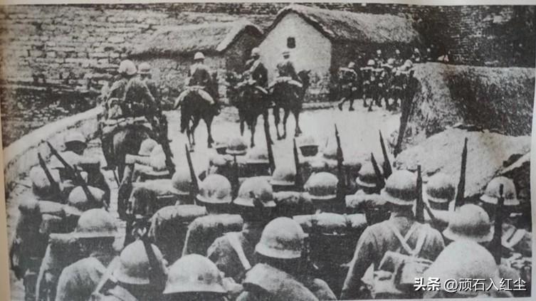 图中,日本兵有5个日本官骑着马,前后分别是步兵,耀武扬威地走在路上。如入无人之境。