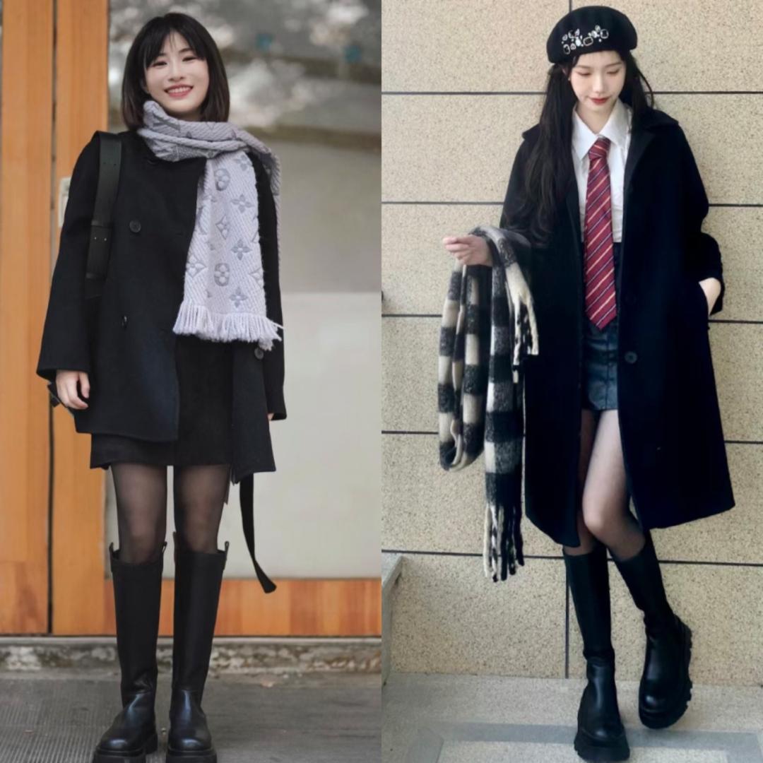 这种搭配能够展现出优雅与时尚的魅力。选择一款短裙和长筒靴,最好是同色系或是经典的黑白配,再搭配上一件黑色大衣和手提包,让整体造型更加时尚迷人。