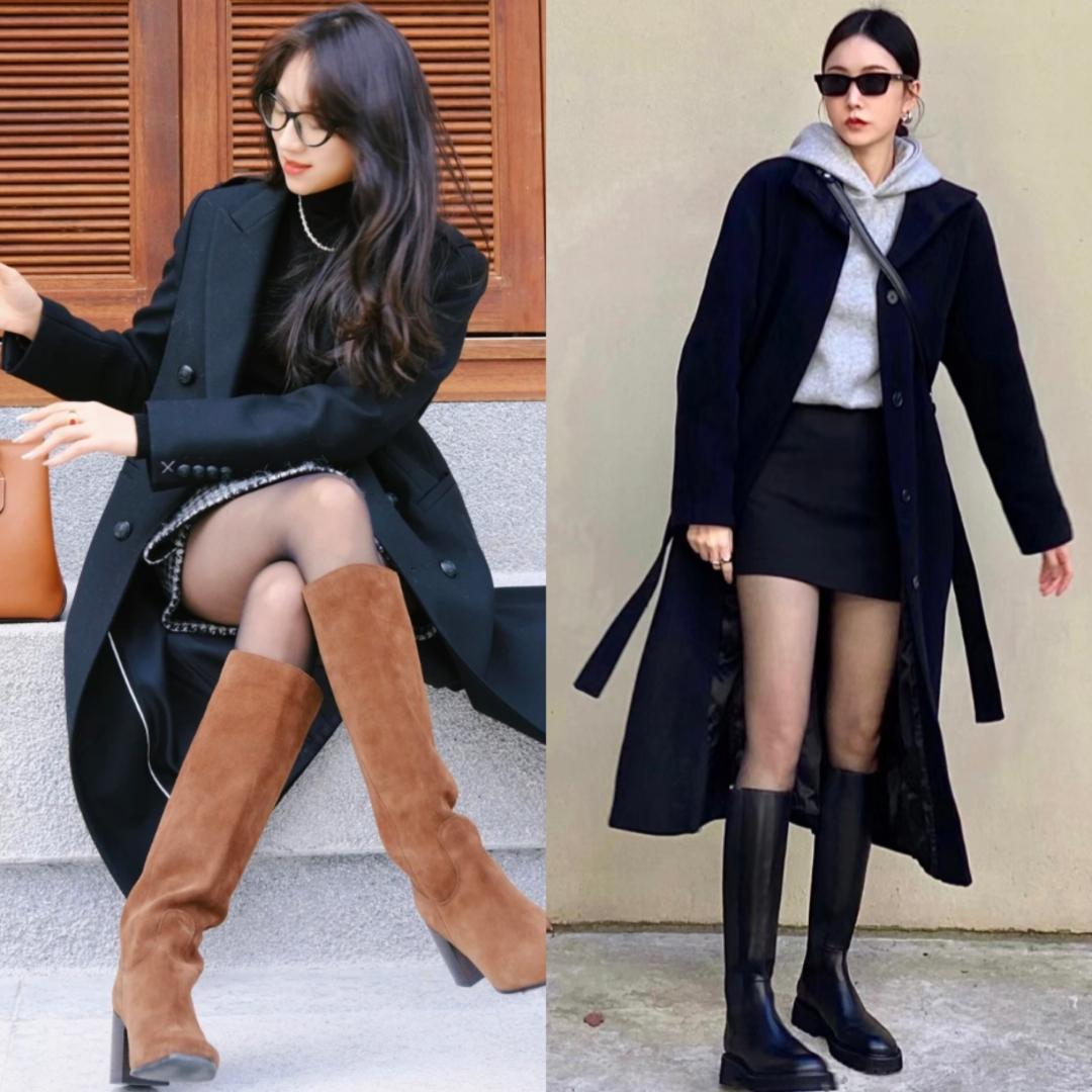 九、黑色大衣+短裙+长筒靴