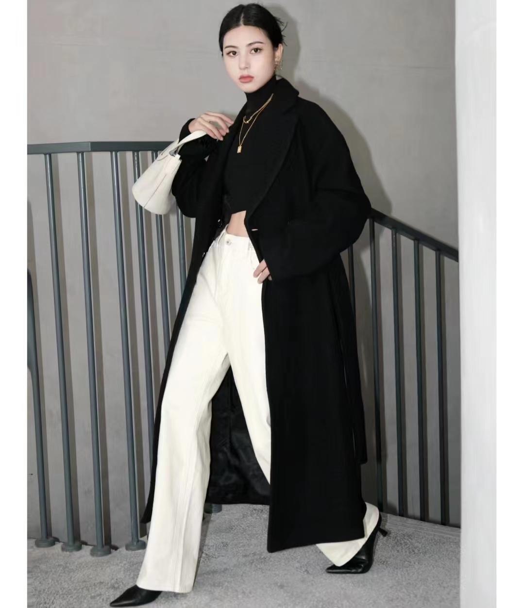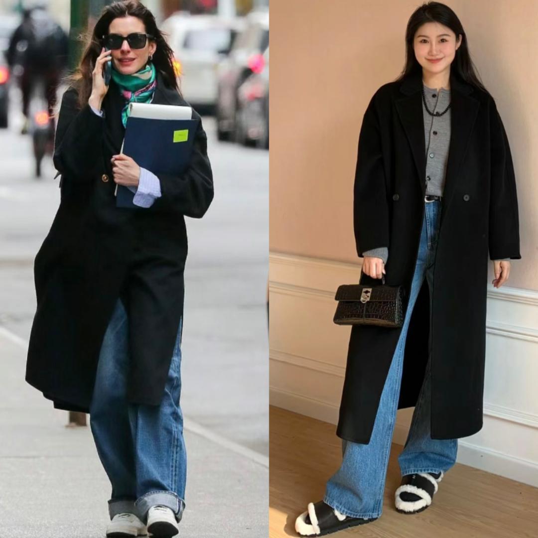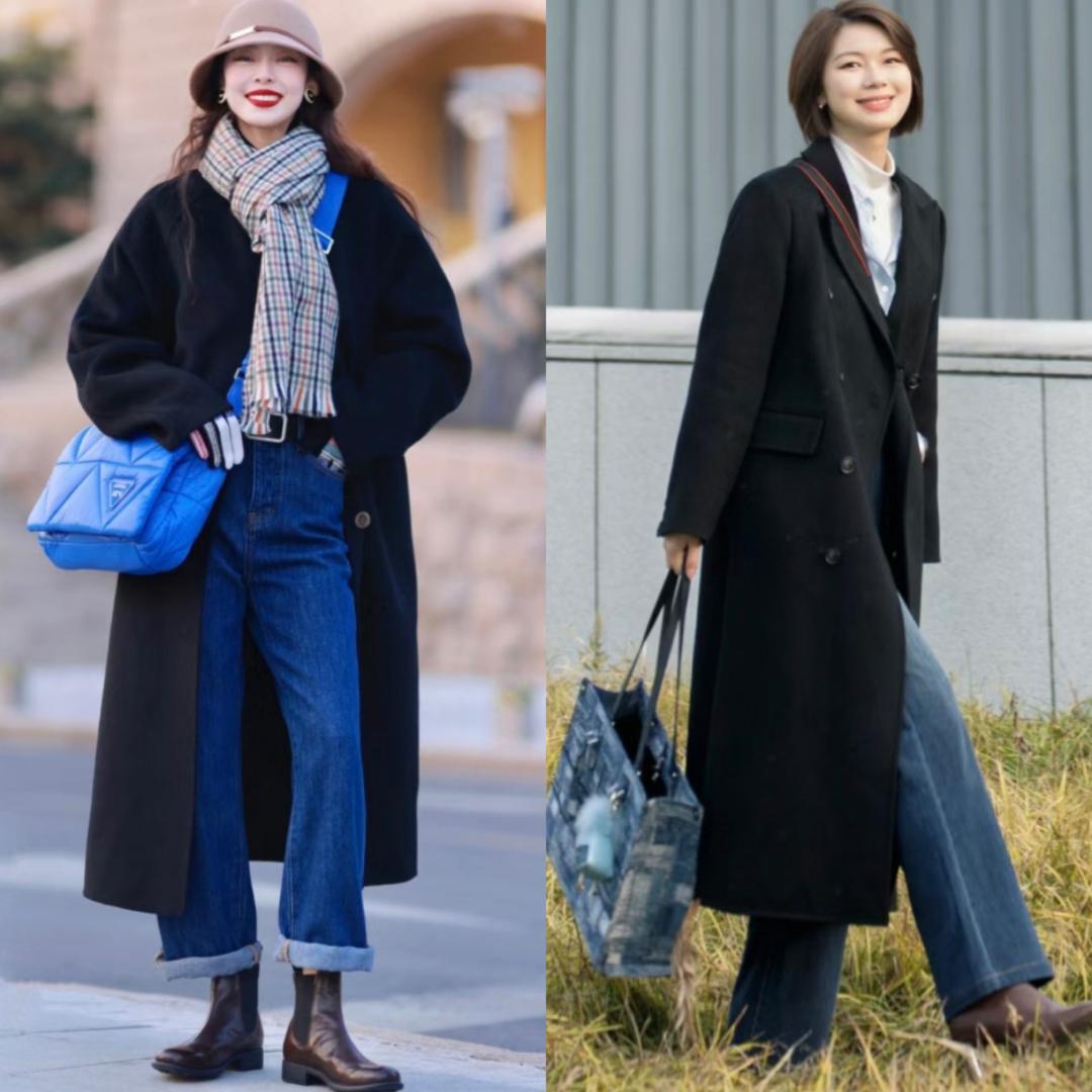 六、黑色大衣+牛仔裤