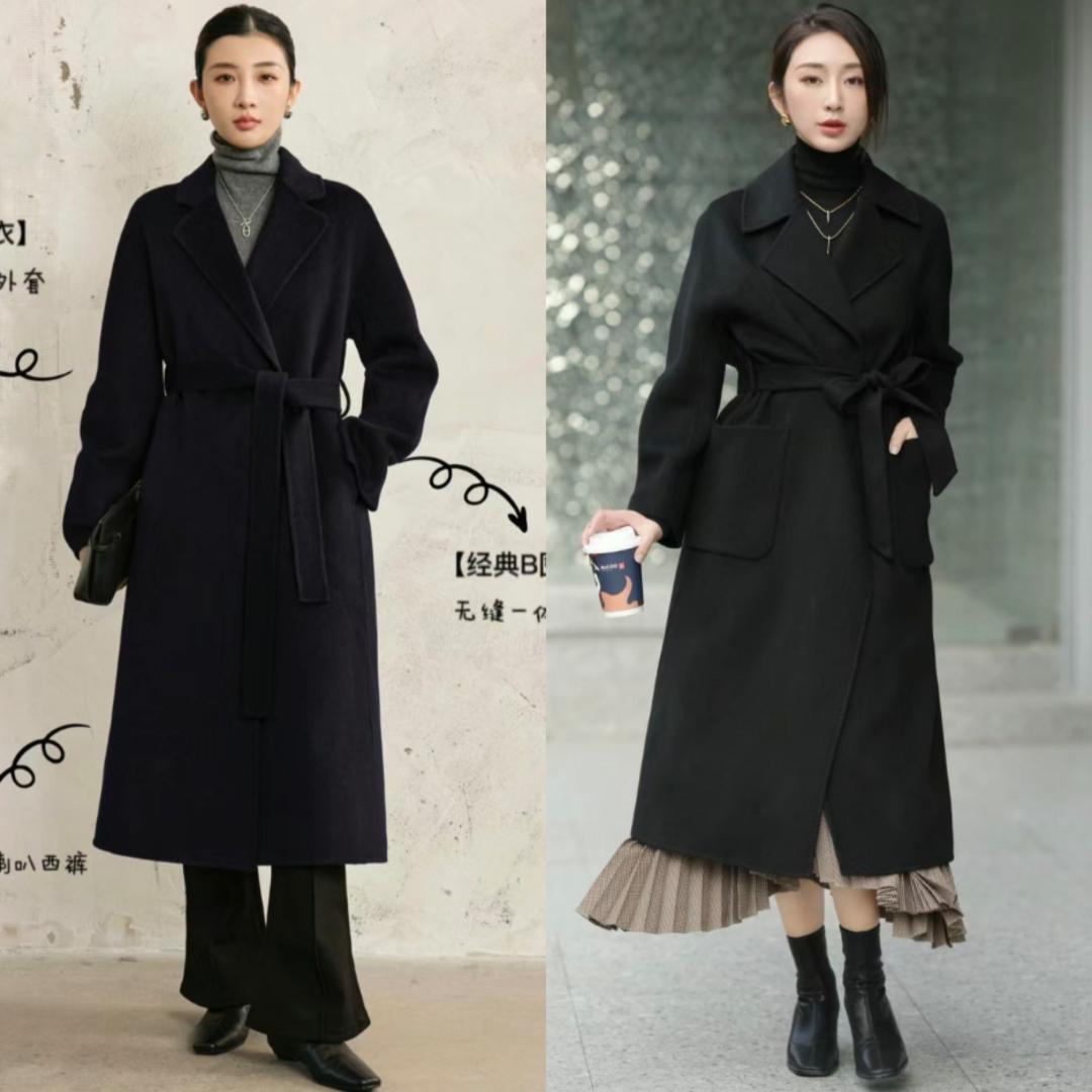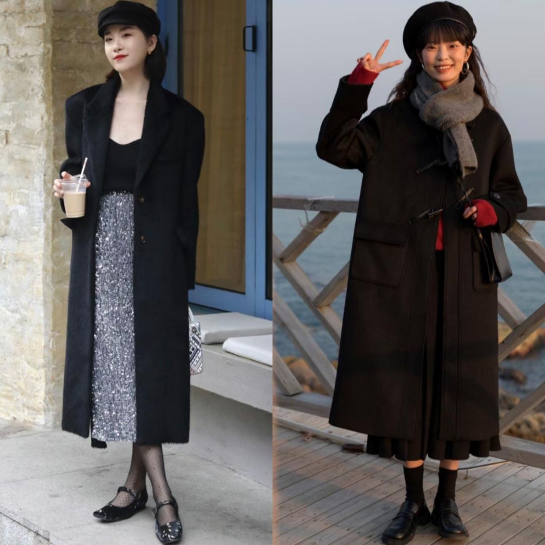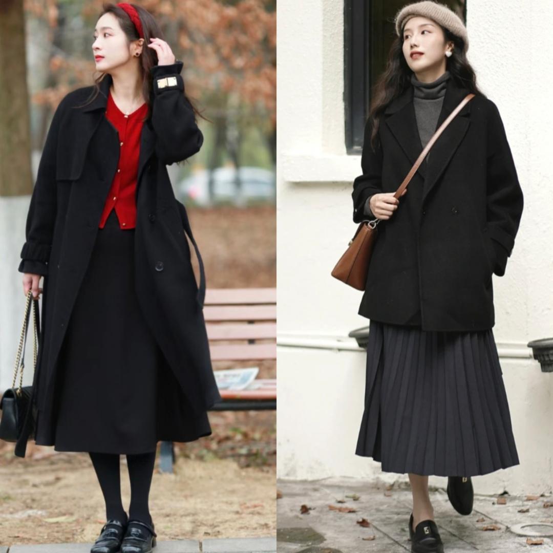 黑色大衣与半身裙的组合,能够展现出优雅与甜美的气质。选择一款及膝长度的半身裙,可以是包臀裙或是A字裙,搭配上一双高跟鞋和手提包,让整体造型更加精致。