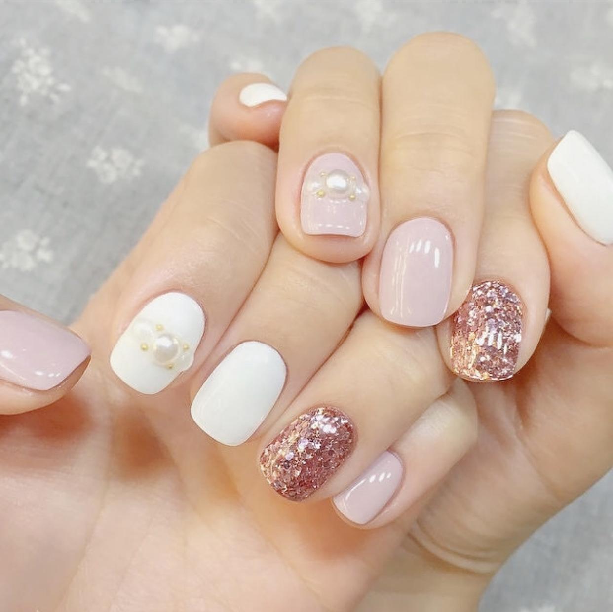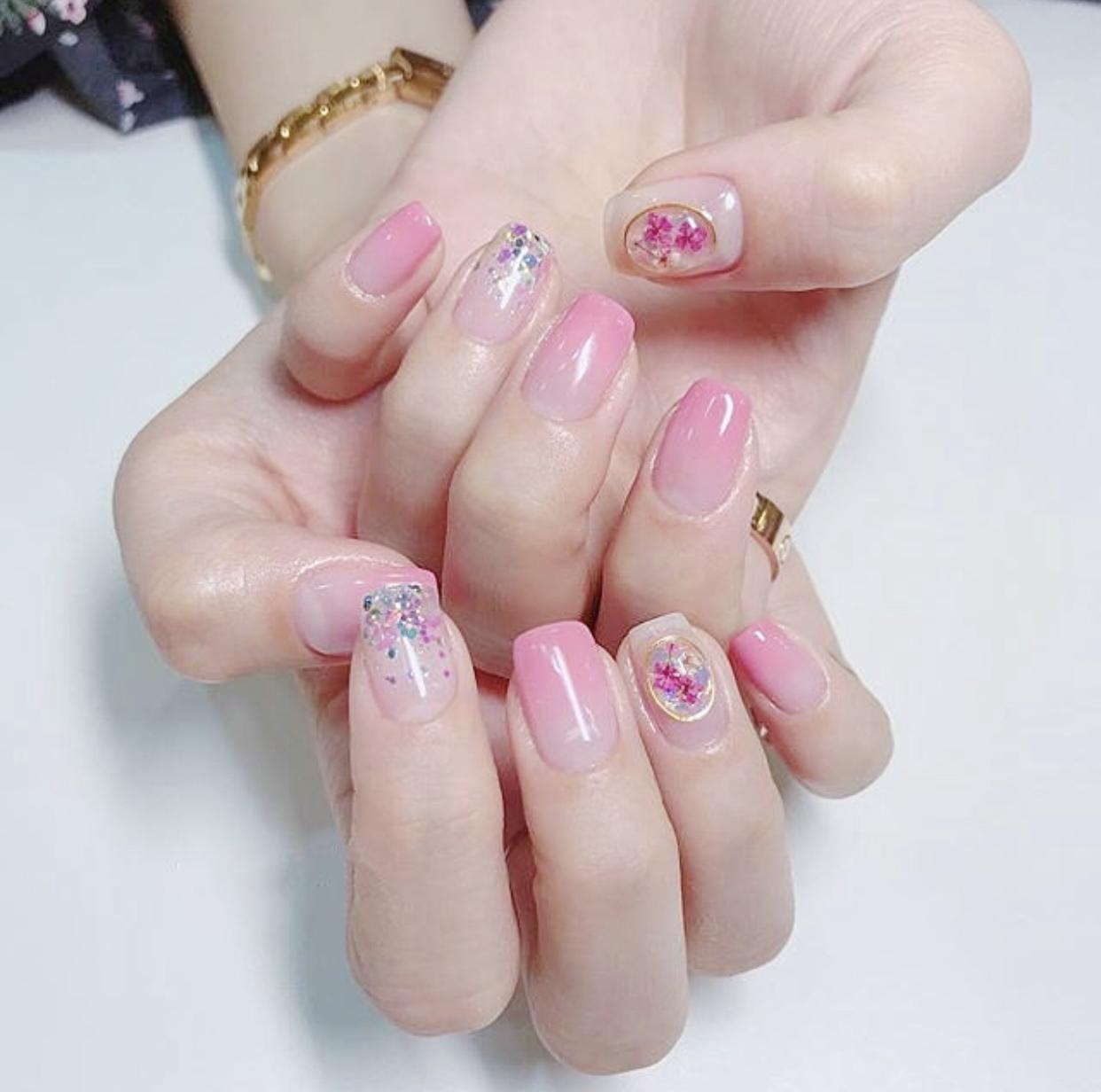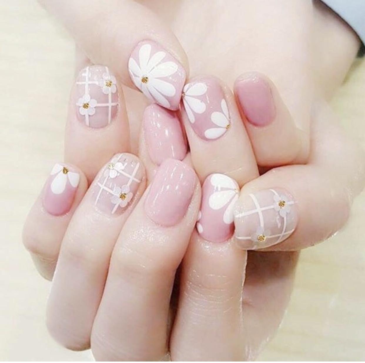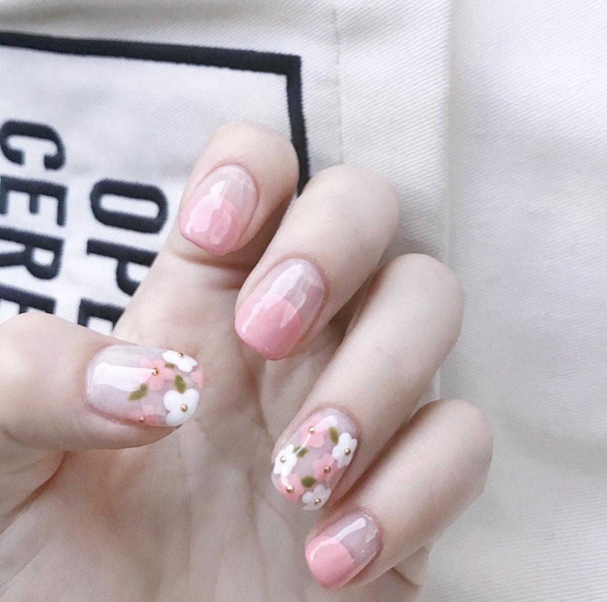 用粉色打造的圆法式,显得格外清新动人,搭配上花卉造型的裸透美甲,气质非常甜美。