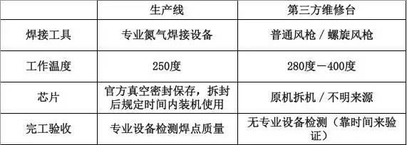 2、市面上常见维修所用的风枪大多较为廉价,价格不同也造成了产品性能的差距。维修工程师根据自己习惯所用的温度也不同。而反观生产线,焊接过程中对空气的含氧量都有标准要求,完全杜绝了焊点的氧化,虽然这点对实际使用影响并不大,但对主板的保护非常到位,因为长时间的高温会影响主板其它芯片,热胀冷缩的道理大家都懂,更严重的还会导致主板变形,这些都是非常可怕的风险。