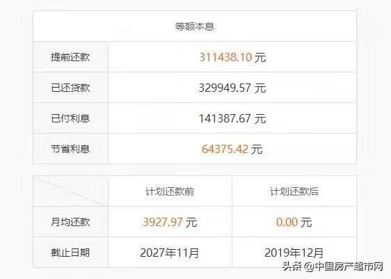 假设贷款金额50万,房贷利率4.9%,贷款15年,如果还款84个月(7年)时提前还款,此时待还房贷本金31.14万,已还本金18.86万,而节省利息64375.42元,此时已付利息141387.67元。