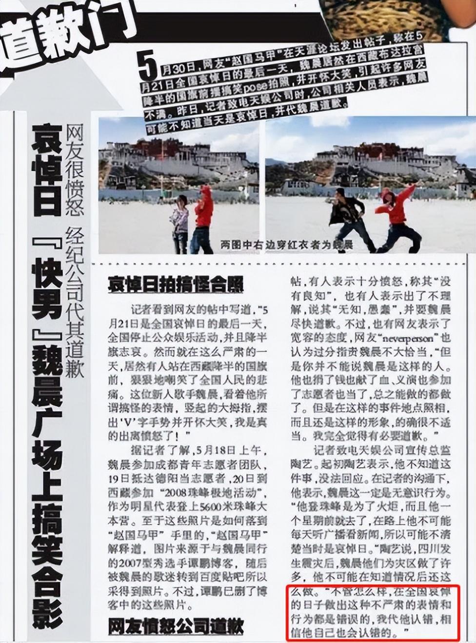 本来这是一件稀松平常的事情,然而发照片的时间点却是5月12日,当时汶川发生特大地震,同胞死伤无数,正值举国哀悼之际,所以魏晨也被推上风口浪尖,事后他急忙发出道歉声明,并作出澄清,称照片是助理拍摄的,自己监管不力,才导致照片流传到网络上。