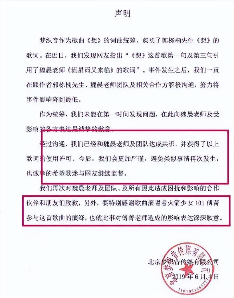 2019年6月,前火箭少女成员傅菁发布了新歌《想》,但是不久后就被网友扒出,这首歌中有几句歌词抄袭了魏晨的《流星雨又来临》。