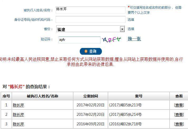 金融界网站银行频道在追踪陈长芹本人的失信信息时发现,失信人员名单中确实有其人,并有三个立案信息,最早的立案信息是2016年9月20日,另外两个都是2017年9月20日立案的。