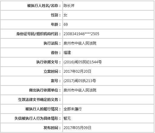 已过古稀之年,陈长芹如何欠下如此巨款?据媒体报道,2016年9月至2017年5月,陈长芹先后六次被列入失信被执行人名单,执行法院分别为泉州中院、郑州中院、厦门中院、河南高院,执行情况均为全部未履行。