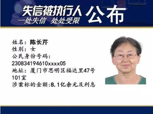 福建泉州中院近日公布的一份“老赖”名单中,来自厦门思明区的71岁老太陈长芹以涉案标的金额8.1亿元位列榜首,引发关注。