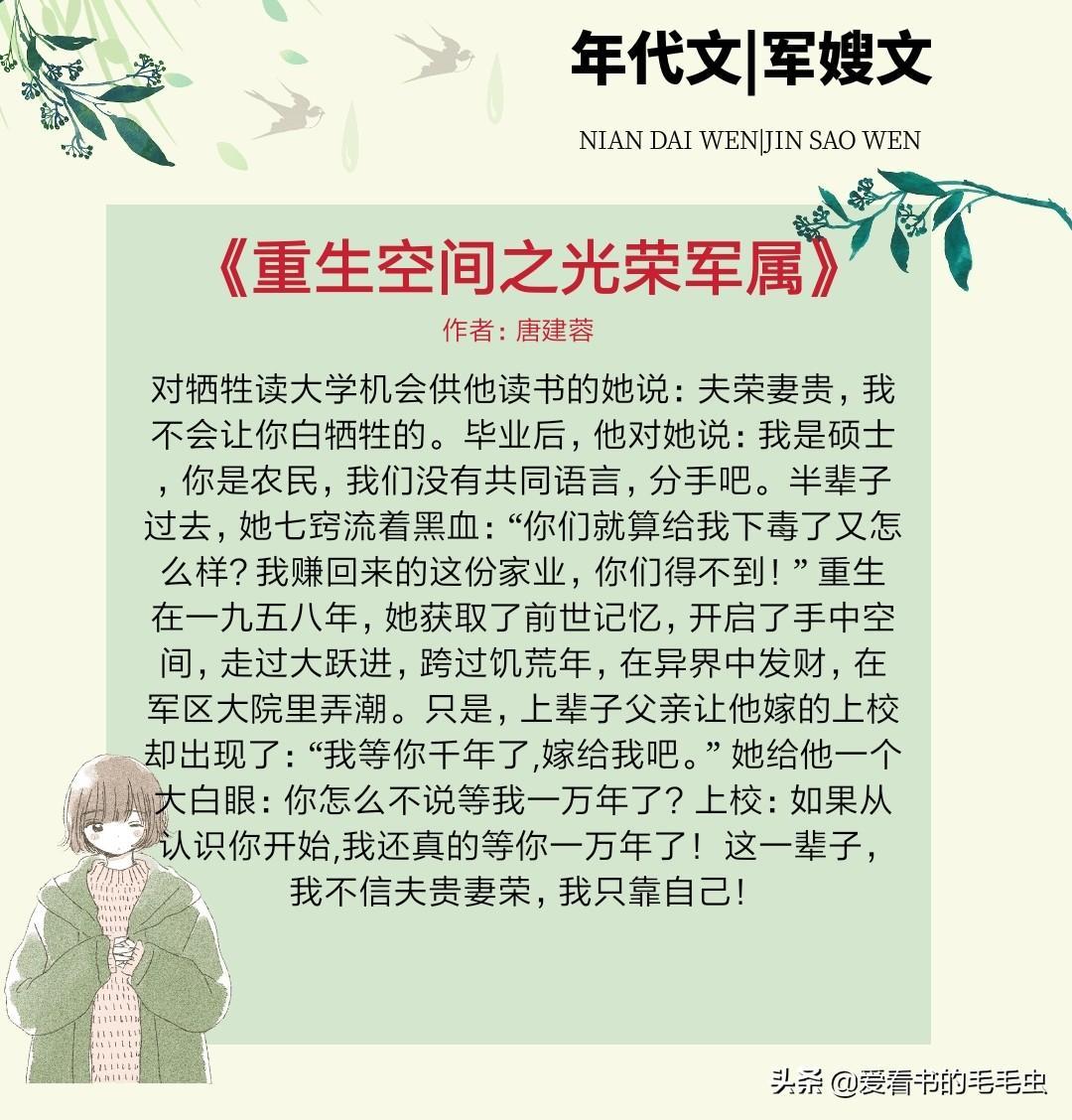 2,书名: 《重生空间之光荣军属》 又名:《重生空间之光荣年代》 作者:唐建蓉