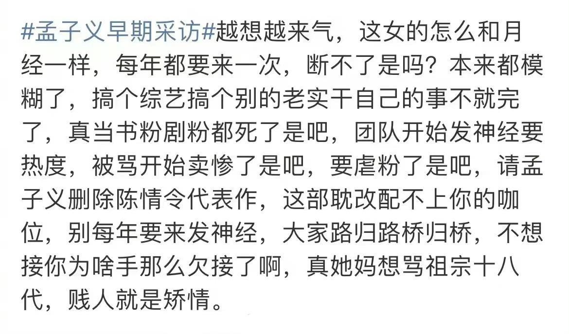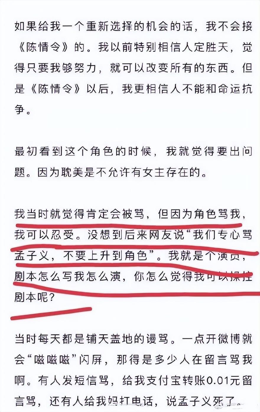 整件事的诱因就是这条一年前的采访,孟子义说后悔接《陈情令》这个剧本。她在采访中还表示自己并没有改剧本,并且反问网友怎么觉得自己可以操控剧本呢?因为《陈情令》出演的角色而被很多人留言骂,能够感觉到孟子义在这个采访中表示非常委屈。