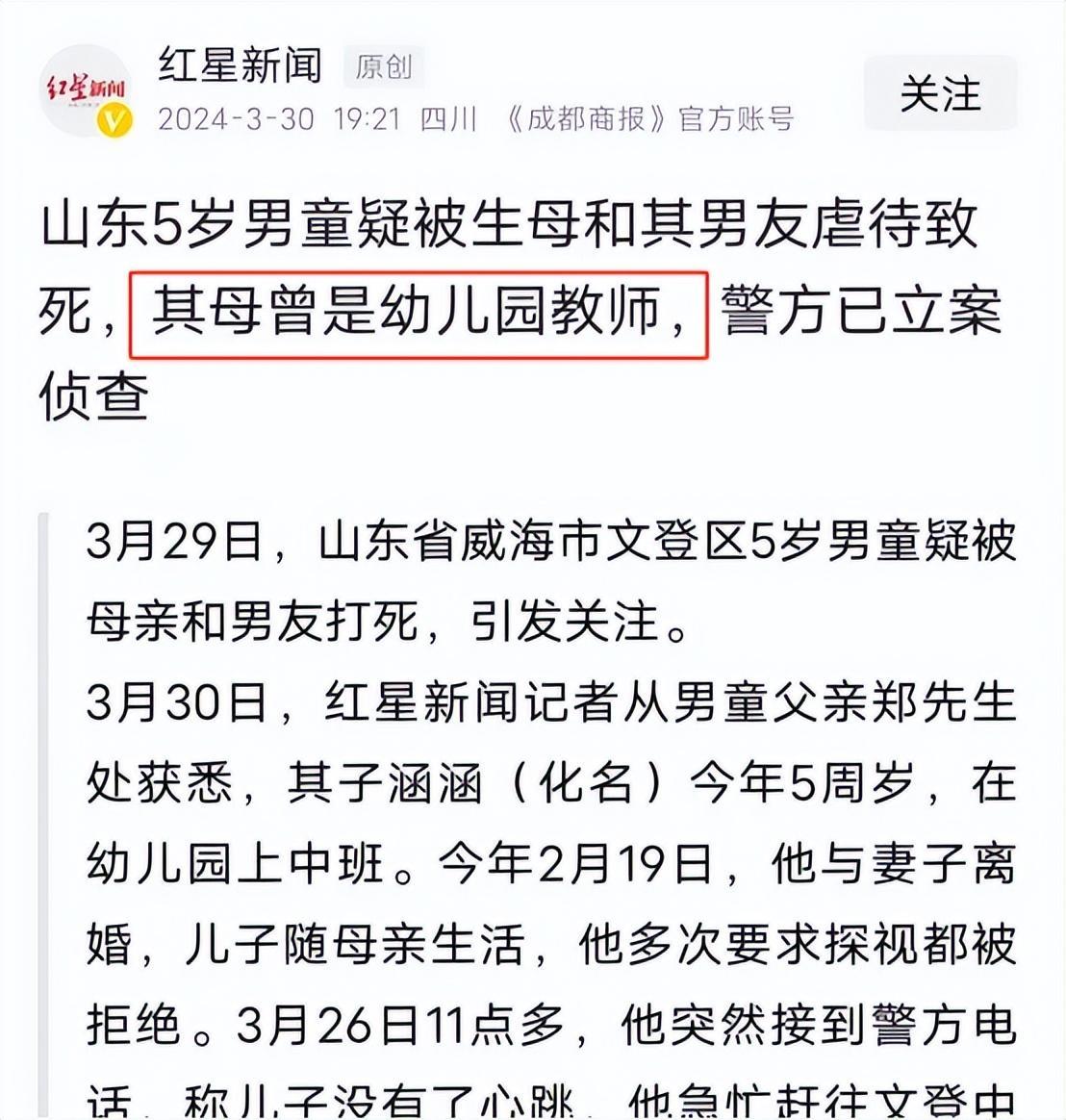 第一,时间线是怎样的?根据当地警方的通报,3月26日,涵涵父亲接到警方电话,要他赶往一家医院辨认儿子的遗体。随后他在医院看到了令人心碎的一幕:5岁的涵涵脸上青一块紫一块,身上也遍布着触目惊心的伤痕。难怪警方说这是一起“疑似非正常死亡“的案件。