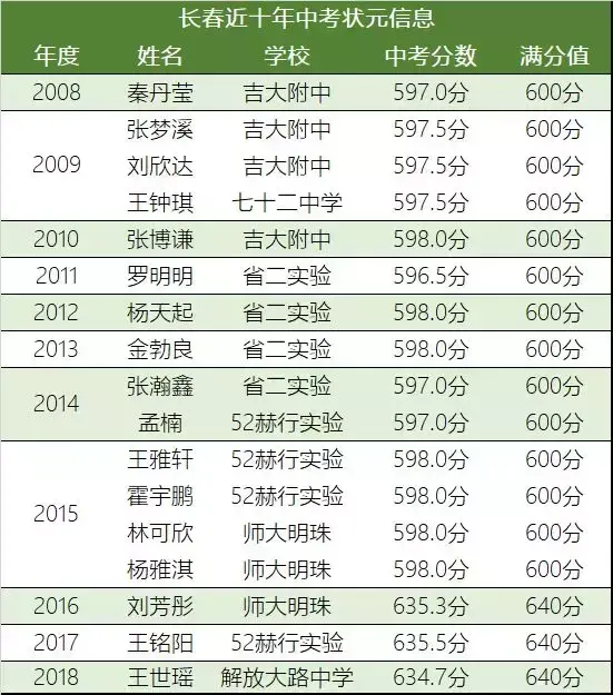 从2008年到2018年,长春市中考裸分最高的状元一共出现了17个。其中吉大附中出现四名,省二实验出现四名,52赫行实验出现四名,师大明珠出现三名,七十二中学出现一名,解放大路中学出现一名。
