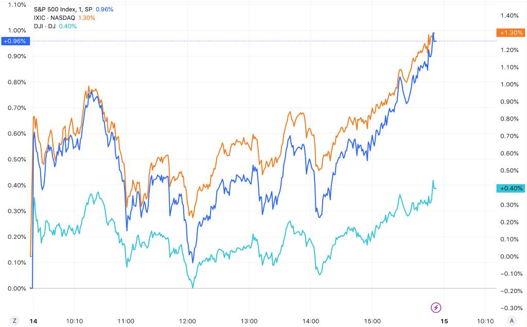 截至收盘,道琼斯指数涨 0.40%,报 38,424.27 点;标普 500 指数涨 0.96%,报 5,000.62 点;纳斯达克指数涨 1.30%,报 15,859.15 点。