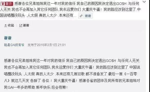 16年的02月01日,GAI爷在微博宣布退出GOSH,这时候GAI爷也是将微博名从 "就是GAI没有爷" 改成了大家熟知的 "GAI爷只认钱" 。