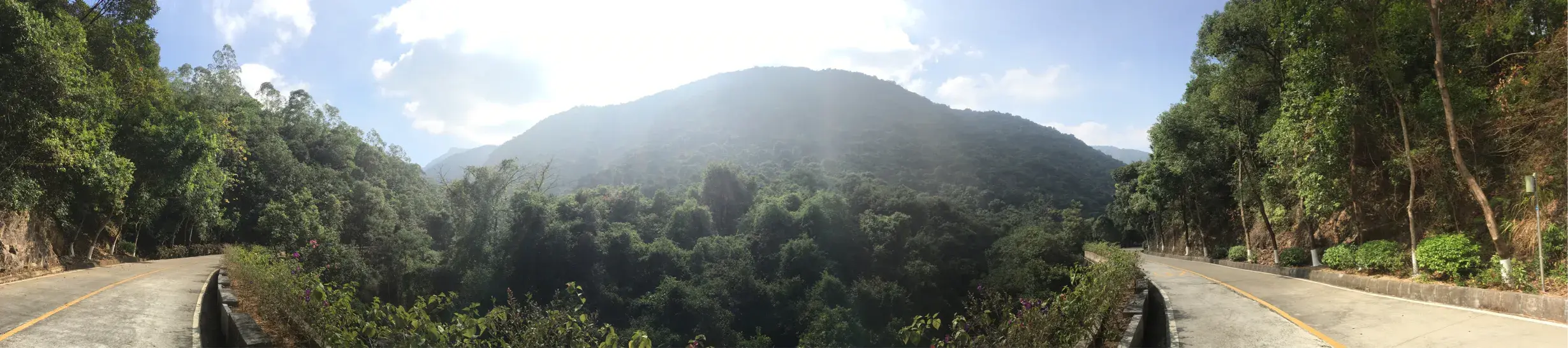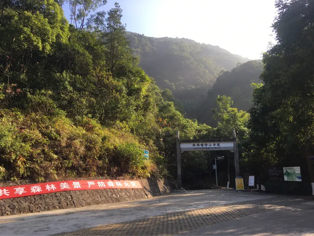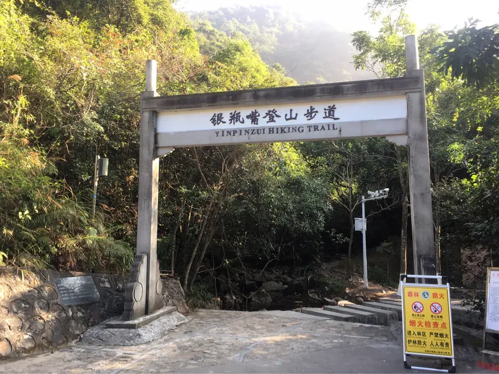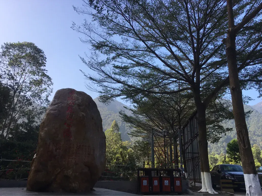 早上8点驱车出发距离寮步50多公里的东莞第一峰银屏山。天气不错,但也不是很理想,有点颗粒感。一路高速,下了高速10公里到达第一停车场,9点到达。第二停车场只有景区的摆渡车可以进,所以不做车的只能的,只能从第一停车场开始徒步了。
