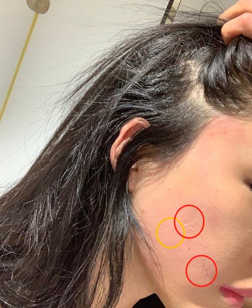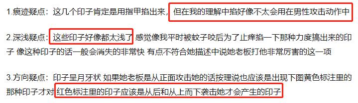 首先是脸上的伤痕明显是指甲印,但生活中男性打人一般不会用掐的,其次这些印子都太浅了,不太符合潘南奎说老板打她打得很厉害,然后是方向,指甲印显出了好几种方向,有正面的但更多是从后和从上往下。
