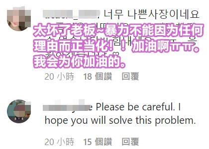 评论区中有好几国语言,有网友说“太坏了老板,暴力不能因为任何理由正当化!加油,我会为你加油”,为她愤怒为她心疼。
