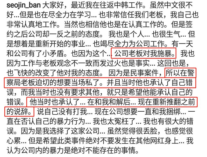 与前一次的秒删不同,这次的潘南奎显然是准备对抗到底,她使用中韩双语在外网发长文痛诉老板的暴力行为,因为她原本就是从韩国来中国工作,关注她的网友有各国人。