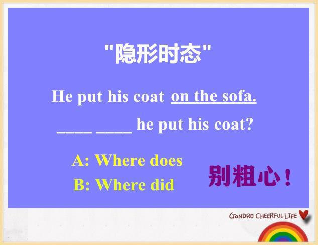 此题考查“隐形时态”,on the sofa 表示位置,提问用特殊疑问词 where,第二空使用助动词do/does/did之一;分析原句时态,如果是一般现在时,he是三单,put需要变为puts;故原句时态为一般过去时,put的过去式仍是put;所以第二空应该填 did;