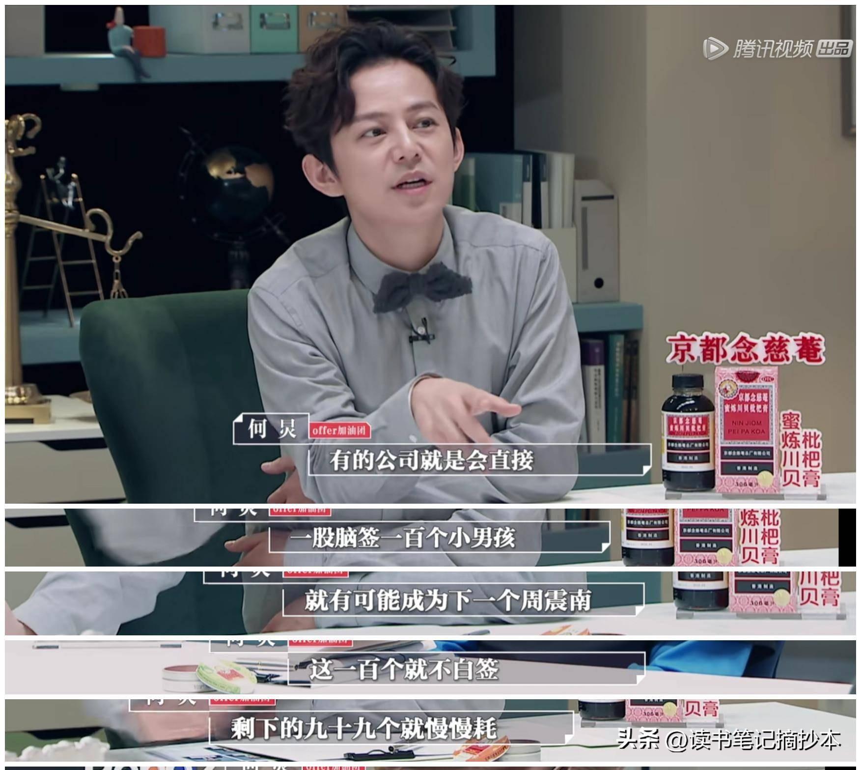 (1)首先,何炅之前批判过娱乐圈天价违约金的事情。