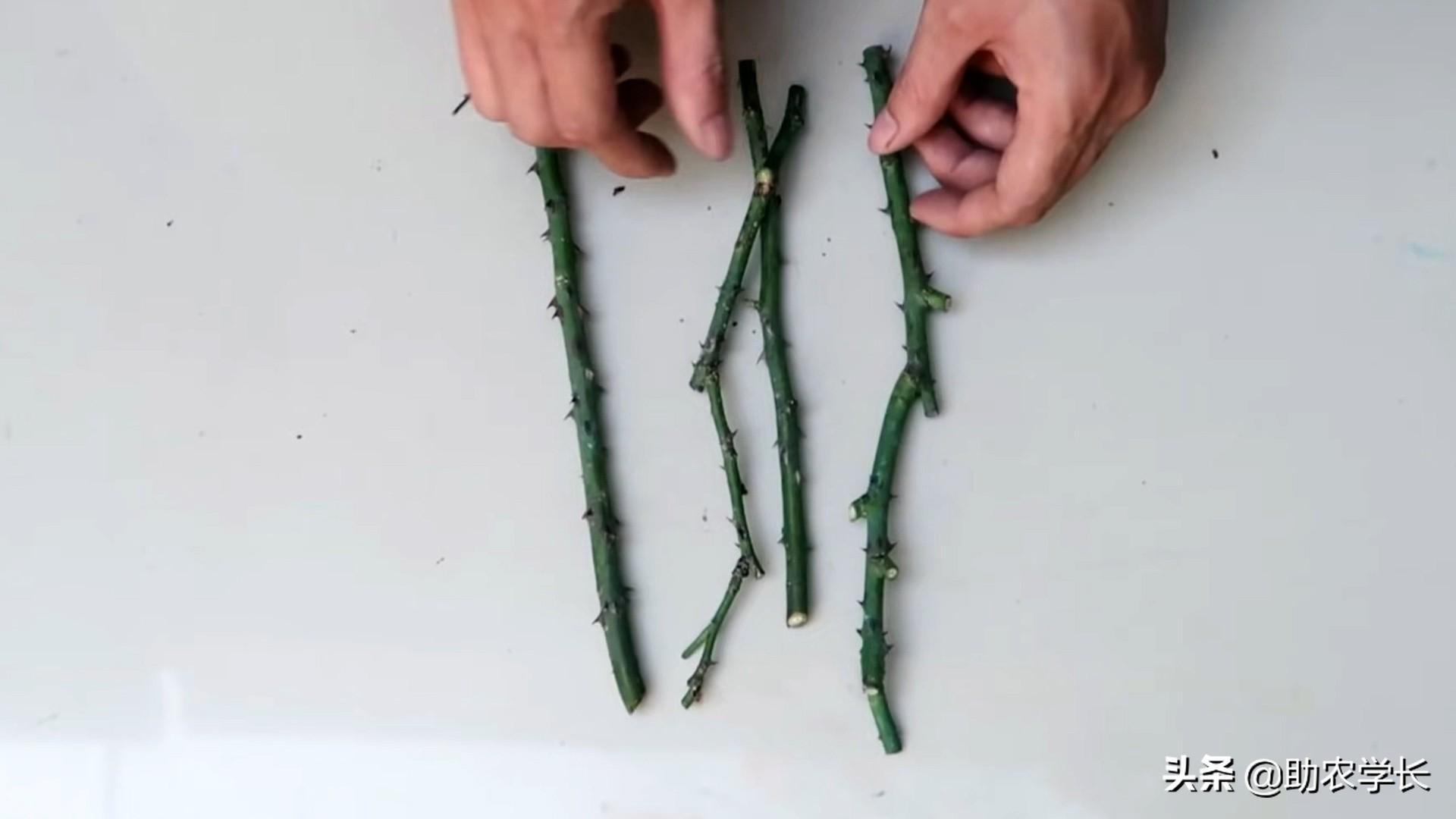 我们在生长旺盛,叶片繁茂的玫瑰花枝条上选取枝条,把它剪下来,这样一条粗壮的枝条,我们可以分出来很多株。