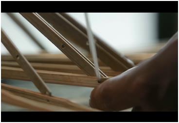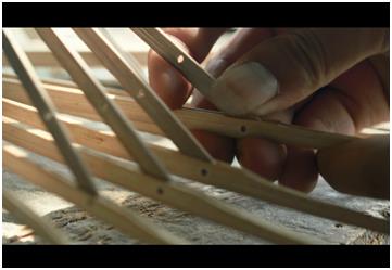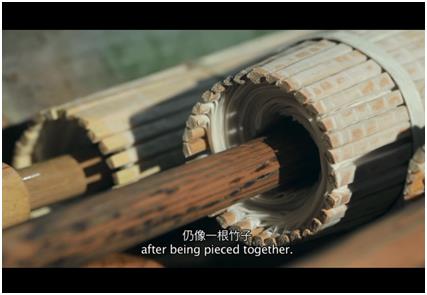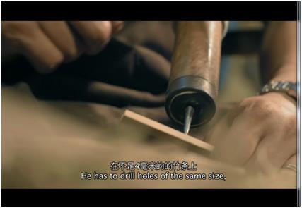 钻孔,余万伦用家乡带来的工具,在不足4毫米的的竹条上钻出同样大小的孔洞,32根,位置、大小也必须完全相同。检验竹条的标准只有一个——它们在拼合后,仍像一根竹子。