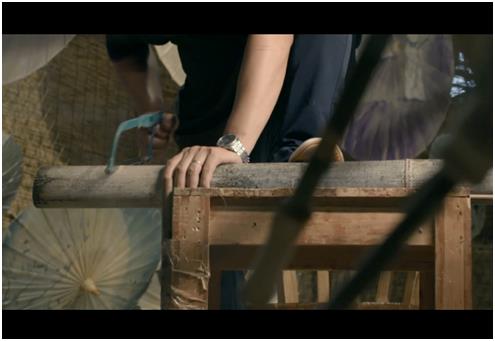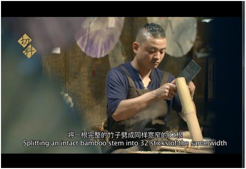 将一根完整的竹子劈成同样宽窄的32根,每一根竹条同样宽窄,同样薄厚,同样坚固,它们将一齐组合成油纸伞的整个骨架。