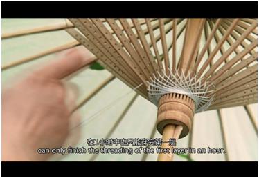 32根伞骨仍需绳线千丝万缕的相连。从第一针数至最中间一根,对应连接伞骨,为的是对称后的牢固。依次往复,最熟练的伞匠在1小时中也只能穿完第一层。