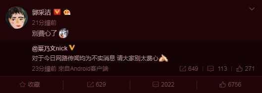 事实上,郭采洁疯传恋上大15岁古天乐时,她不仅透过经纪人牛奶(叶乃文)回应,“对于网路不实消息,均不予回应,请大家别太费心。”本人12日傍晚时,也亲自在微博上发文,转发牛奶的澄清文辟谣,“别费心了”,文末更附上歪头吐舌笑的狗头造型图案,似乎对于莫名而来的传闻哭笑不得。