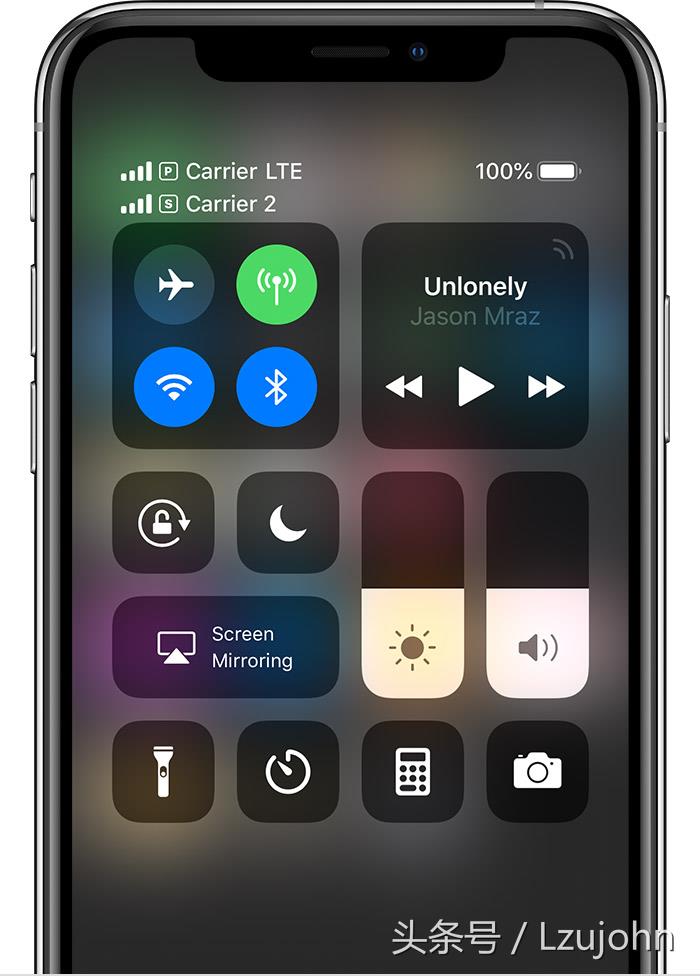 关于双卡状态图标则如上图所示,在上拉控制中心菜单后可以明显看到其双卡型号栏,以及数据流量标志,关于数据流量的双卡切换,则直接到设置-->蜂窝数据流量设置界面可以直接选择,其选项多了两个号码的切换,如上图所示。