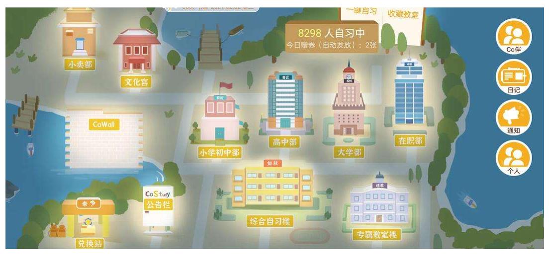 这是一款线上自习室软件,真实还原校园场景,可以按照不同阶段选择教学楼。