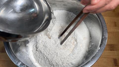 1. 在盆中放入30克面粉,加入清水和面,用筷子搅拌成没有干面粉的面絮