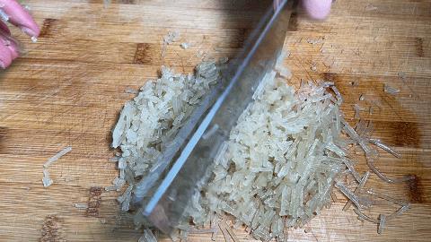 8. 泡好的粉条放在案板上,用刀切成小细段,