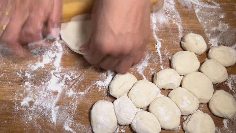 13. 然后用手揪的方法揪成一个个小面剂,撒上干面粉按一下
