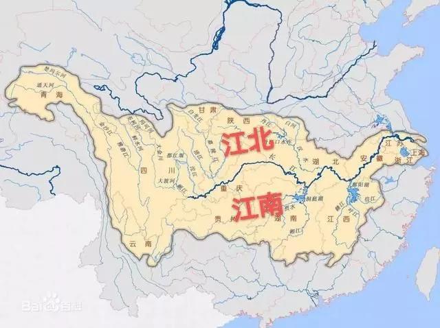 摊开中国地图,若地图上方为西,下方为东,左方为南,右方为北,那么,长江从西往东方倾斜,若以长江为界,江北江南一目了然: