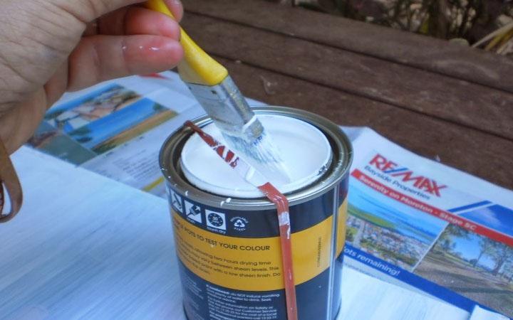 用一条宽橡皮筋垂直缠绕在颜料桶上,它会产生一条水平线,你可以用它把多余的油漆从刷子上擦掉。