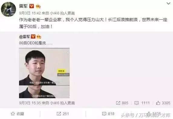称:“作为老老老一辈企业家,我个人觉得压力山大!长江后浪推前浪,世界未来一定属于00后,加油!”