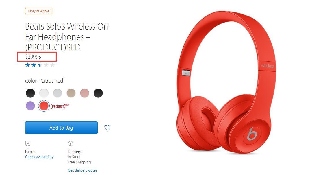 Beats Solo3 Wireless 头戴式耳机在美国官网上的售价(买到就是赚到)