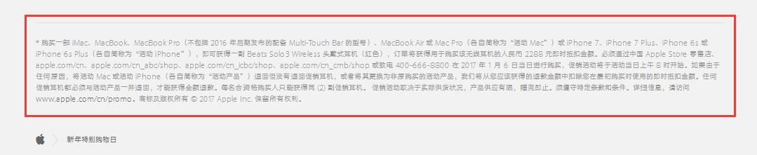 Apple此前宣布2017年1月6日推出「新Beats迎新岁」农历新年购物活动,买指定的 Mac或iPhone即送价值2288元的红色Beats Solo3 Wireless 头戴式耳机,优惠只限一日。
