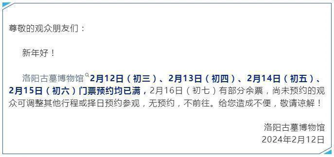 洛阳古墓博物馆 2 月 12 日(初三)、2 月 13 日(初四)、2 月 14 日(初五)、2 月 15 日(初六)门票预约均已满。